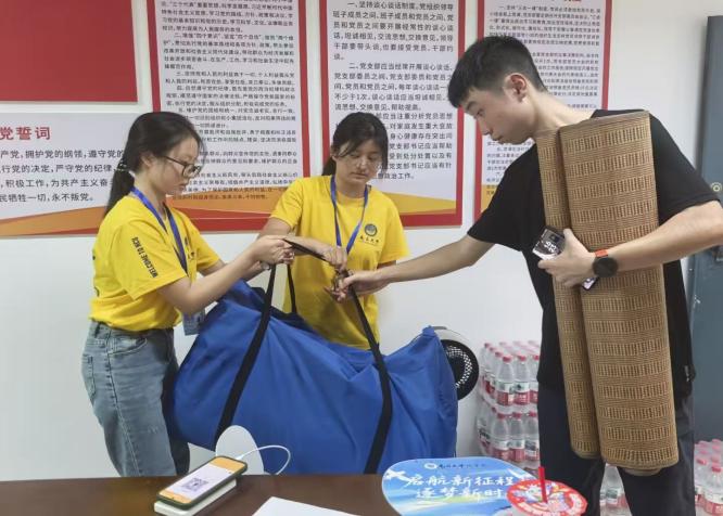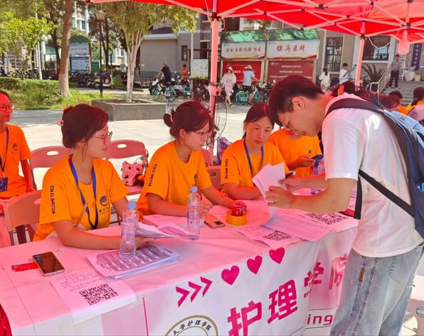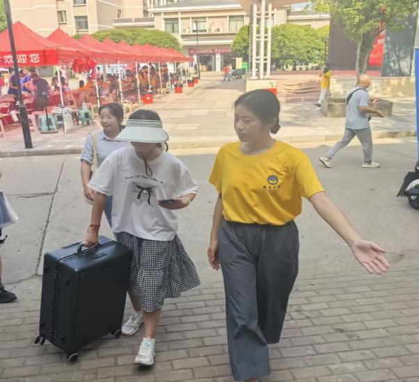 迎新期间,身着特色文化衫的护理学院志愿者们化身校园“指南针”,主动向新生伸出援手,热情引导路线、协助搬运行李,用亲切的一句“同学,这里走”驱散新生初入校园的疑惑与茫然。这份温柔服务不仅成为新生大学生活的“第一扇窗”,更让他们在抵达之初便感受到学院的温暖,为开启崭新旅程奠定良好基础。
