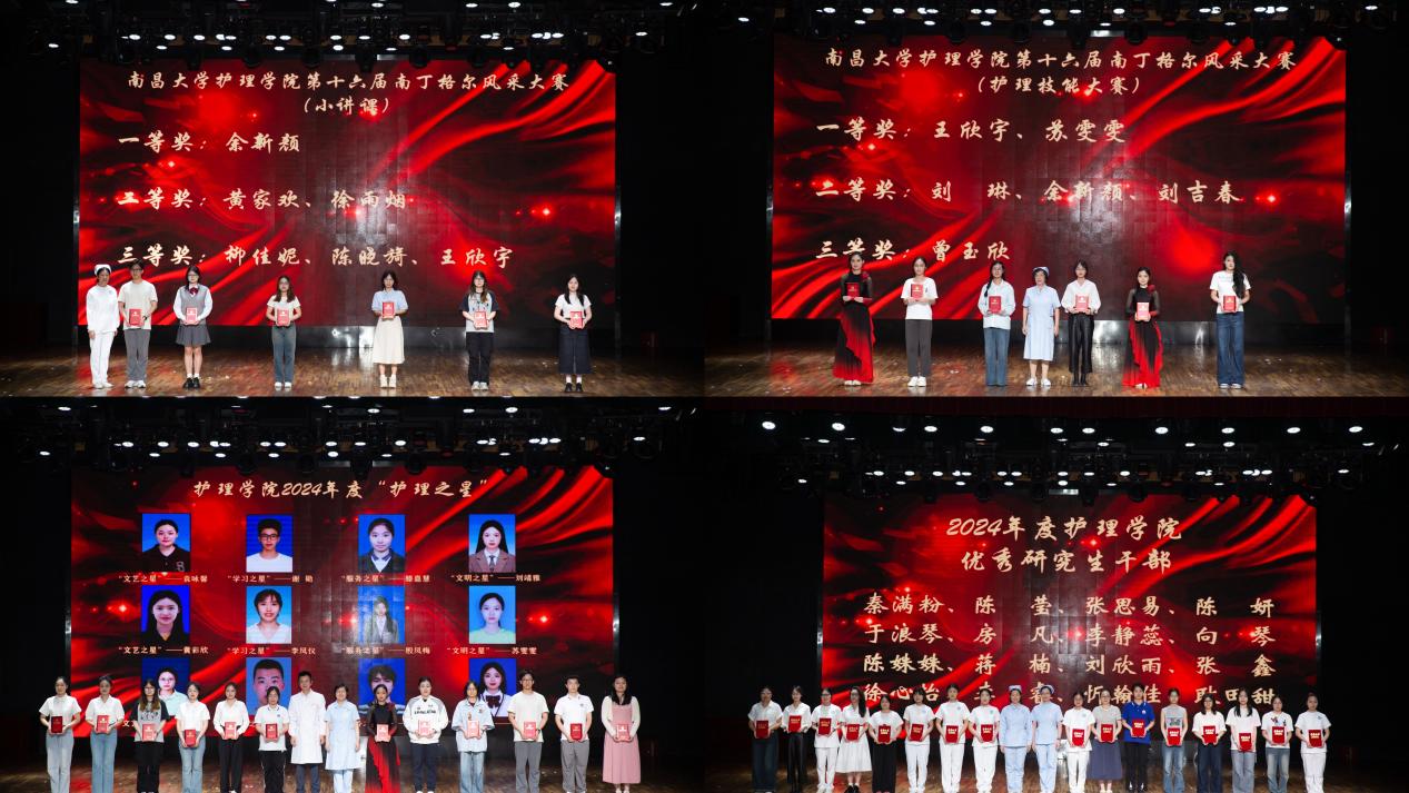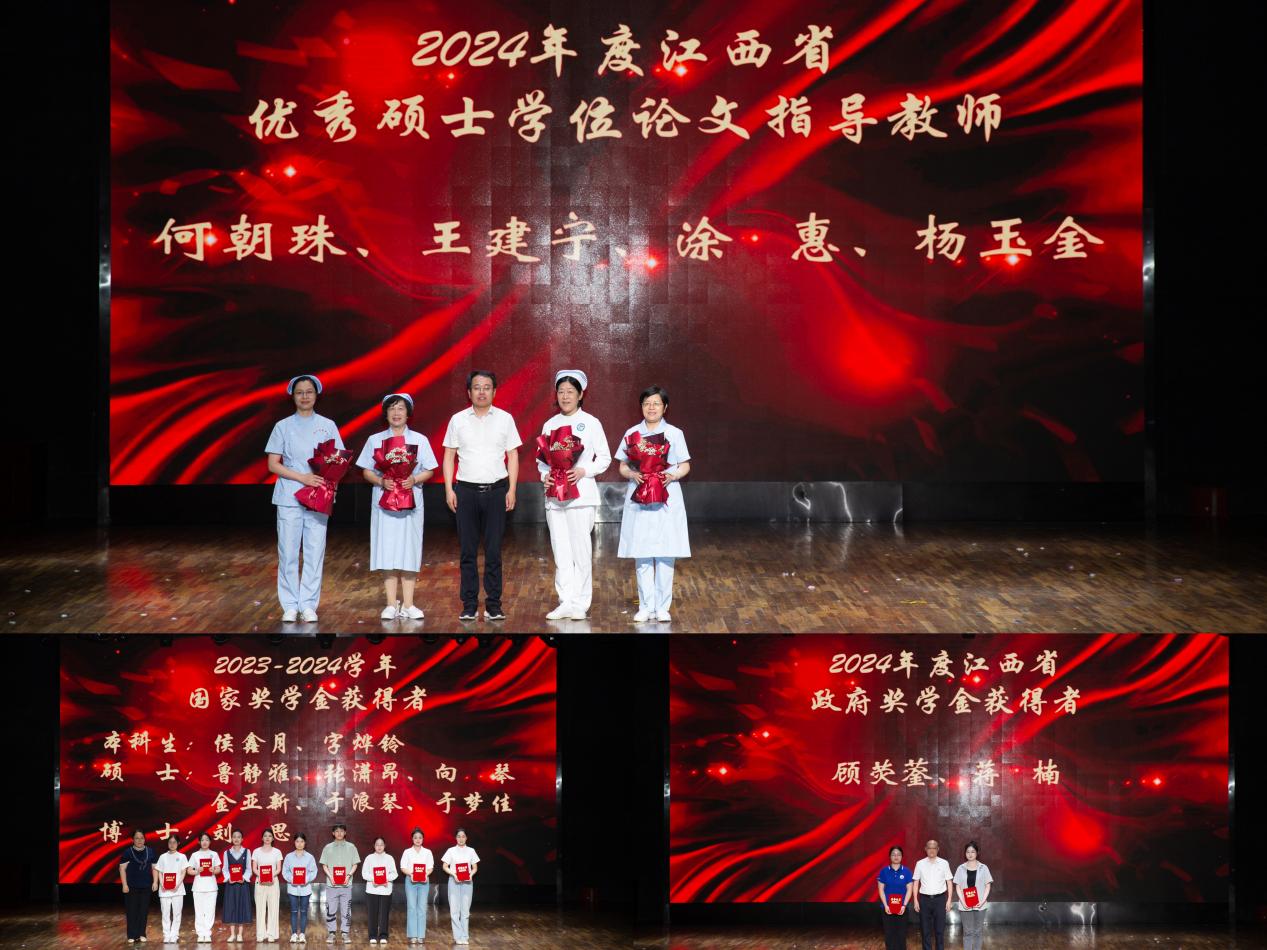 颁奖环节树立奋进标杆,现场表彰了"南丁格尔"风采大赛获奖者、"护理之星"、优秀研究生干部及国家奖学金获得者等先进个人,并向何朝珠教授等4位"江西省优秀硕士学位论文指导教师"献花致敬,掌声经久不息。