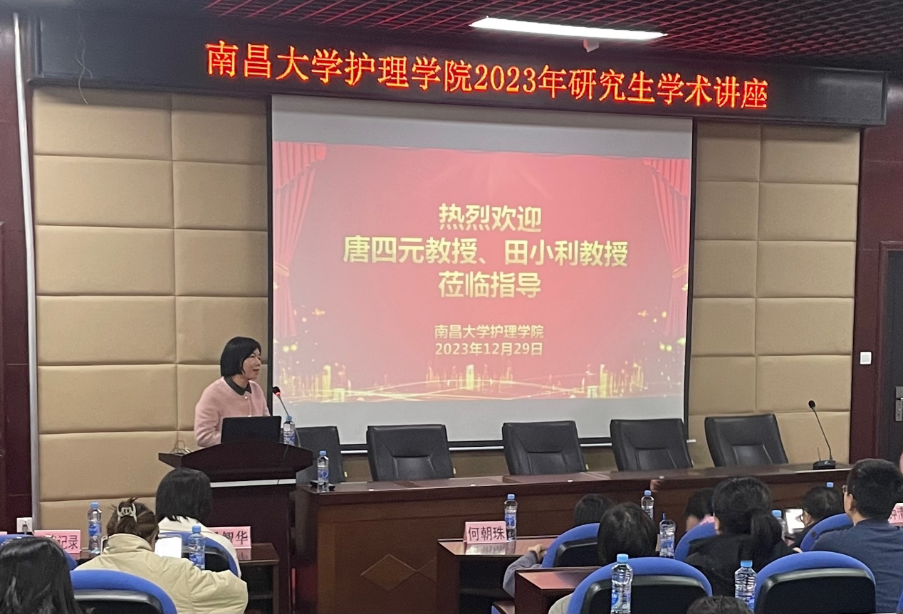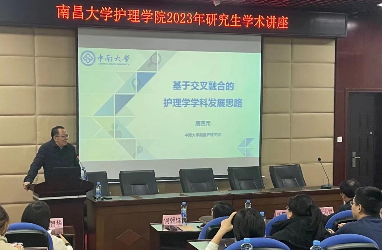 首先,唐四元教授进行了题为《基于交叉融合的护理学科发展思路》的学术讲座,唐教授从解读护理学交叉融合的意义、护理跨学科研究现状、护理学交叉融合的天然优势,推进护理学科交叉融合面临的现实困境、以及护理学与其他学科进行交叉融合的路径等方面做了精彩的阐述,唐教授指出护理应与其他学科相结合,打破护理与其他学科之间的壁垒,跨学科的研究,可以帮助护理人员实施有效的护理干预。
