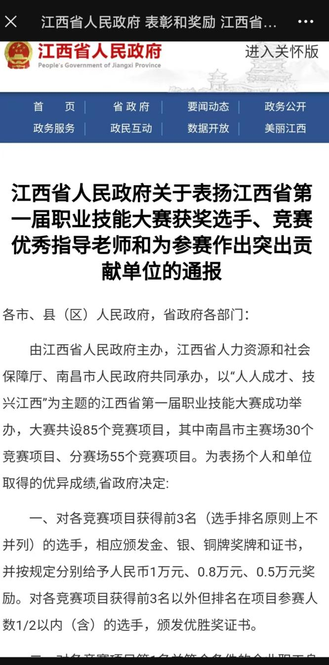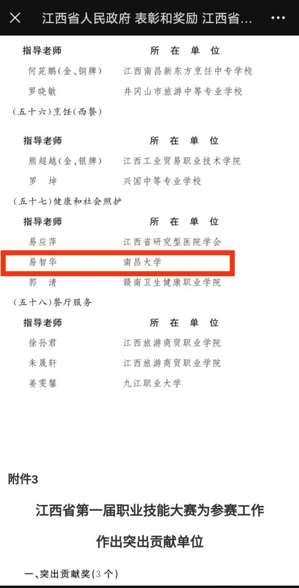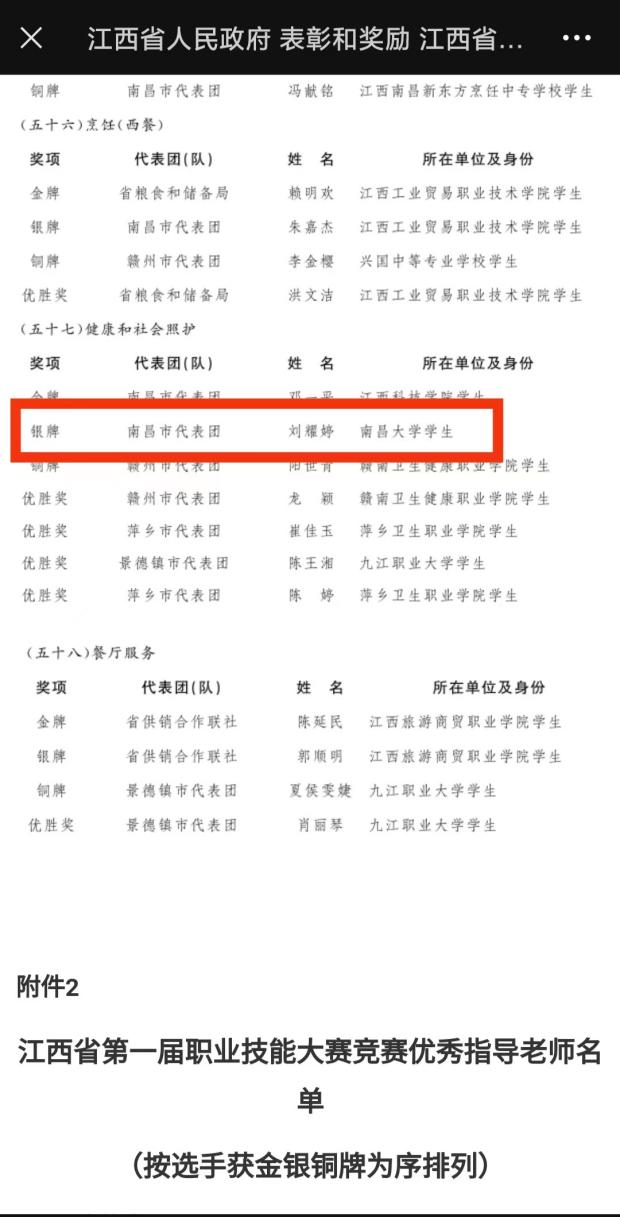 江西省第一届职业技能大赛由江西省人民政府主办,江西省人力资源和社会保障厅、南昌市人民政府共同承办,以“人人成才、技兴江西”为主题,于2022年11月在南昌市举办,共设85个竞赛项目,每个项目正式评出金、银、铜奖各1项及优胜奖4项。我院2019级本科生刘耀婷荣获世赛项目“健康和社会照护”银牌,教师易智华荣获“竞赛优秀指导老师”称号。