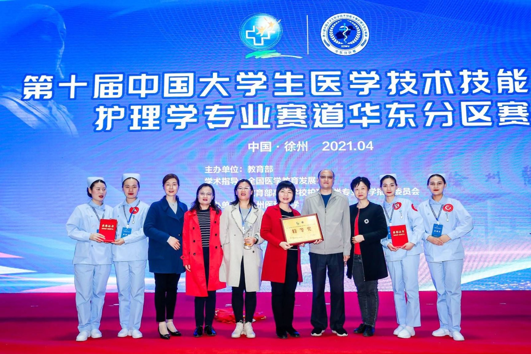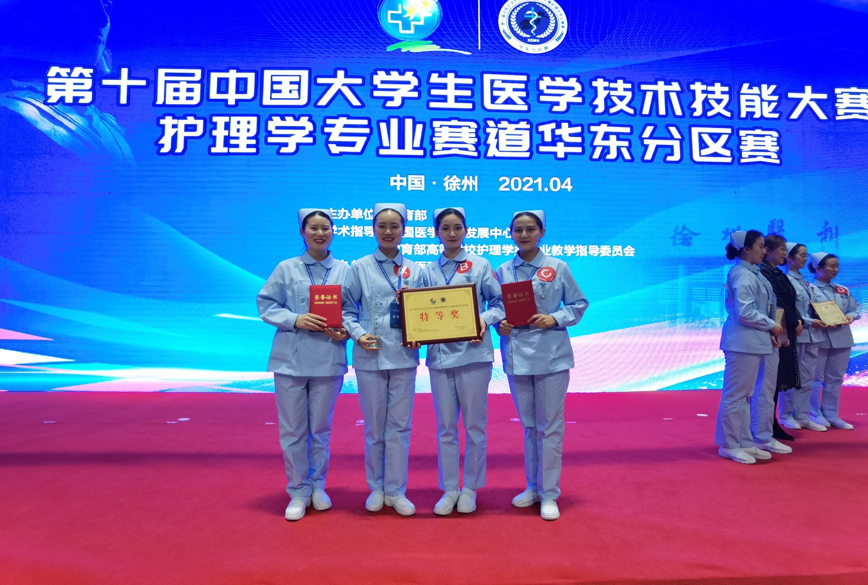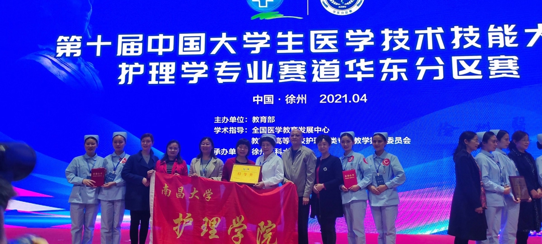 4月18日下午,第十届中国大学生医学技术技能大赛护理学专业赛道华东分区赛在徐州医科大学落下帷幕,此次大赛由我院组队并代表学校参加比赛。在为期2天紧张激烈的比赛中,我院代表队在赛场上逐鹿群雄、一路过关斩将,最终获得华东区特等奖,同时荣获1个单项奖(鼻饲法),并成功晋级全国总决赛。
