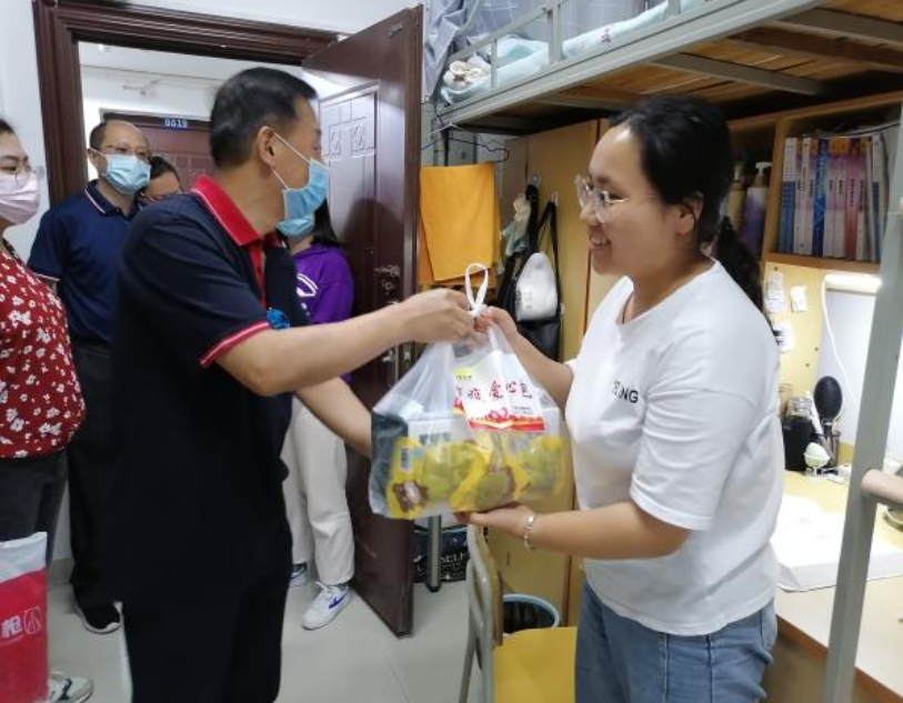 5月9日下午2点,护理学院党总支书记甘永辉、护理学院副院长刘谦、以及2017级胡仙萍辅导员将专门准备的防疫爱心包送往贫困学生宿舍,助力温暖抗疫。当甘书记和刘院长还有辅导员一同去到宿舍时,同学们非常感动。甘书记和刘院长将抗疫爱心物资送给同学们后,紧接着询问了大家的生活安顿情况和思想状态,安慰同学们只要做好自我防护和体温检测,就不会有问题。学校采取了各种措施,提高开学的安全性,降低同学们的健康风险和担忧。同时,有什么生活和学习上的问题和建议,都可以和学院老师或者领导进行沟通,一定会妥善处理。心理上也让同学们放宽心,对于学校在疫情期间的一些强制性安全措施予以理解,互帮互助,互相理解。同学们听了后,纷纷表示受益良多,而且一定会加强理解。