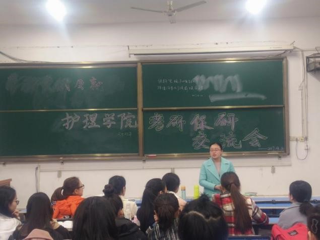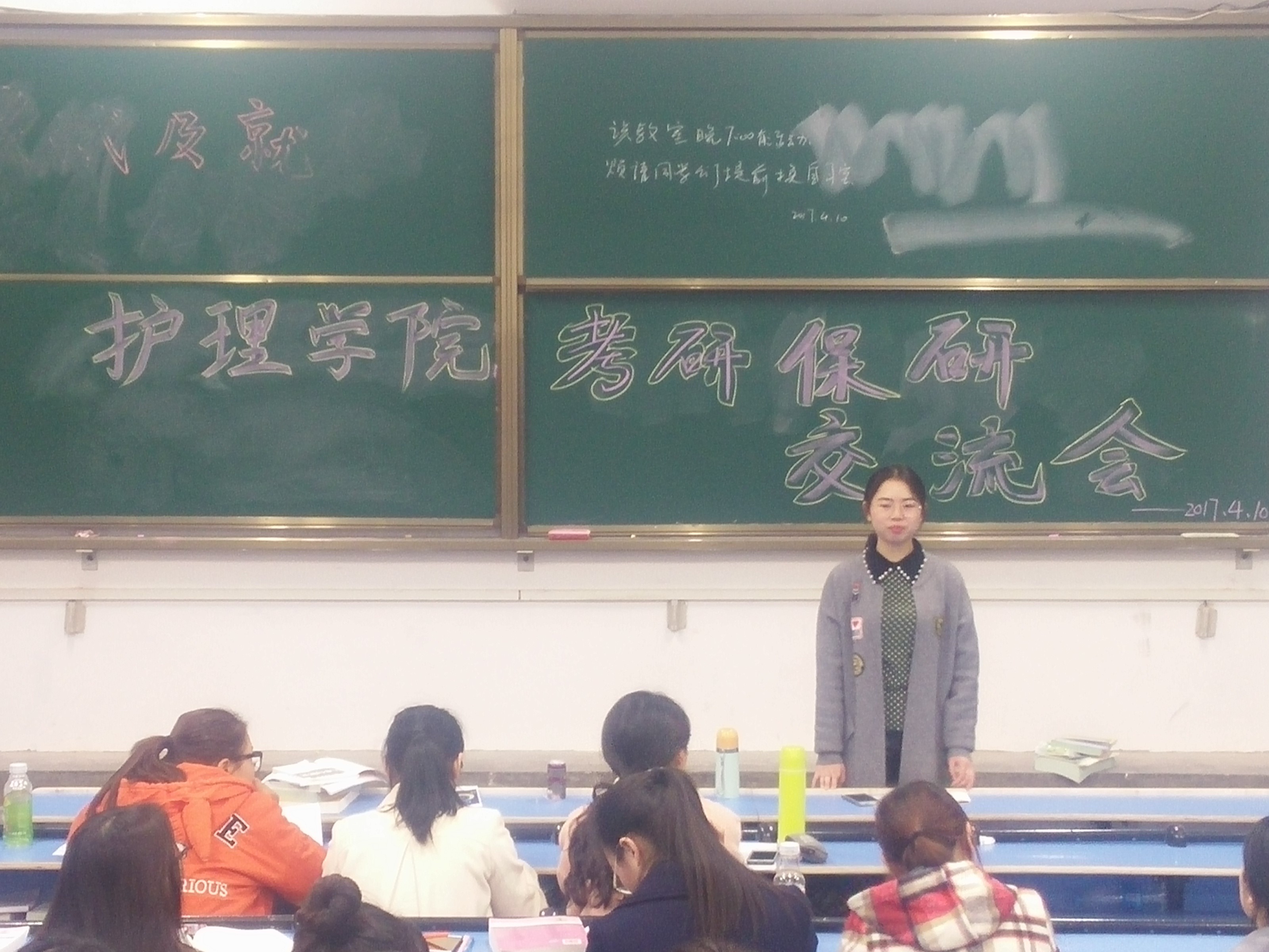 (护理学院 记者 邓巧)为了加强学生对考研知识和经验的了解,营造积极向上的学风,为学院正在备考的学生加油鼓劲,护理学院于2017年4月10日晚7点在东湖校区4002教室举办了考研、保研经验交流会。本次交流会有幸邀请到了在今年均已优异成绩成功考研和保研的五位学姐为同学们介绍自己的考研心得,结合自己的经历详细给同学们讲解了在备考期间应注意的问题,包括考研的复习方法、考研信心的树立、考研计划、备考心态的调整、作息时间安排、选择专业方向和复试等方面的一些心得。
