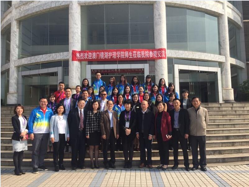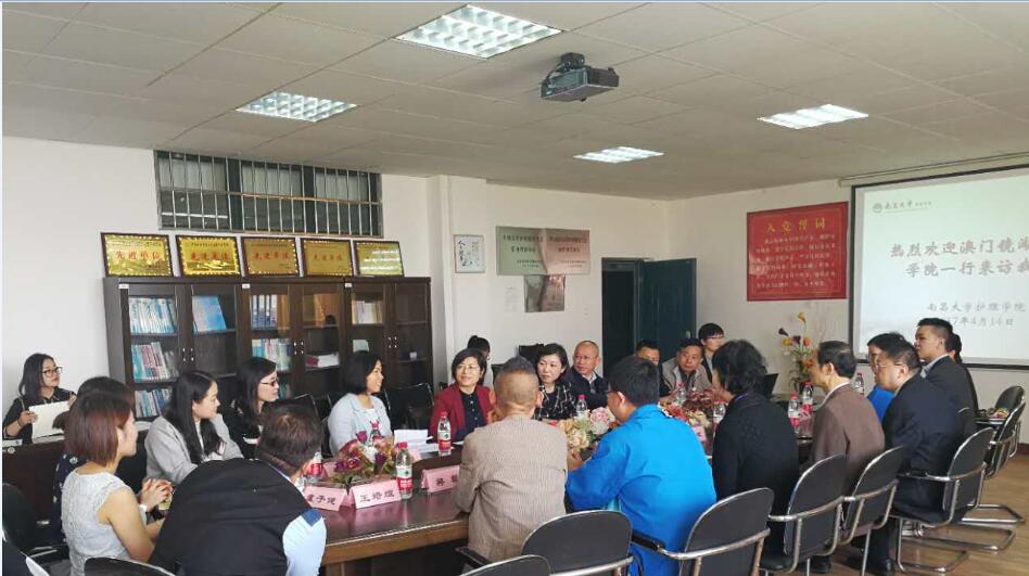2017年4月14日上午,澳门镜湖护理学院师生一行26人来我校护理学院访问交流。中联办广东联络部叶俊斌副巡视员、澳门镜湖护理学院邢志红副院长、江西省教育厅胡泽伟主任、医学部罗时文副主任、护理学院何朝珠院长、钟清玲副院长、彭金生副书记等参加座谈交流,会议由南昌大学港澳台事务办公室周婷主任主持。