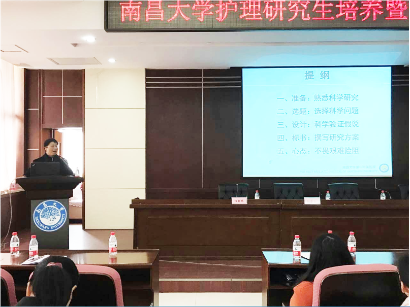北京协和医学院护理学院院长刘华平,教育部高等学校护理学专业教学指导委员会秘书长孙宏玉,南昌大学医学部副主任罗时文,医学部研究生党总支书记吴臻,南昌大学第一附属医院科技处处长张焜和,学院党总支书记甘永辉、副院长钟清玲及部分硕士研究生导师、临床带教教师、研究生代表等300余人参加。培训班由学院院长何朝珠主持。