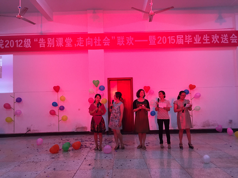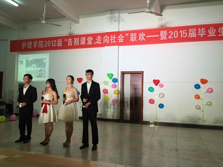 2015年6月9日晚七点,护理学院在东湖校区大学生活动中心举办“2012级告别课堂,走向社会”联欢—暨2015届毕业生欢送会。学院全体教职员工与学生欢聚一堂欢送2015届毕业生。
