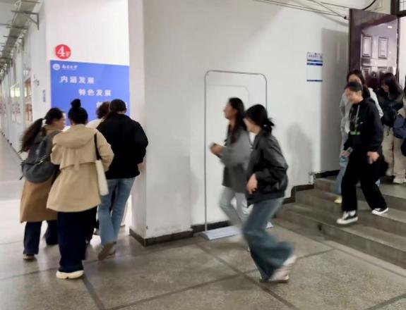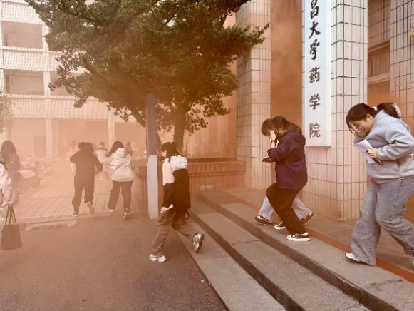随后,随着警报声响起,演练正式启动,同学们即刻进入应急状态,迅速以培训所学的规范姿势做好防护,弯腰俯身、捂住口鼻,沿着预设逃生路线快速移动,有序冲下楼梯穿过模拟烟雾区域。演练过程中,大家既保持撤离速度,又自觉维护秩序,部分同学还主动提醒身边同伴注意规范动作,在短时间内便全部安全抵达指定区域,顺利完成演练任务。