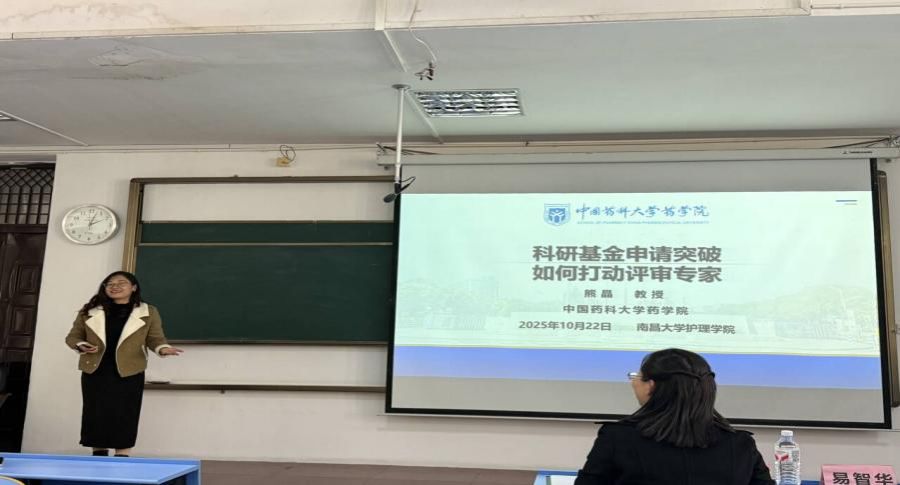 2025年10月22日下午,南昌大学护理学院“南护菁谈·科研创新论坛”第二期在东湖校区教学大楼4001教室如期举行。本期论坛聚焦“科研基金申请突破:如何打动评审专家?”这一核心议题,特邀中国药科大学药学院药理系党总支书记、副主任熊晶教授(博士生导师)担任主讲嘉宾,为学院师生带来一场基金申请“破局”指南。学院领导易智华、李鸿艳及百余名师生到场参与。论坛由李鸿艳副院长主持。