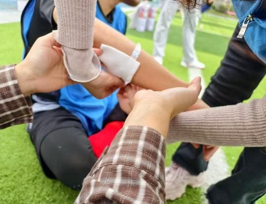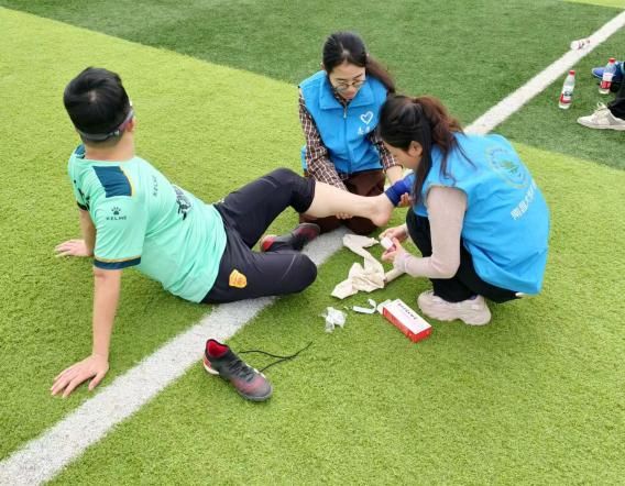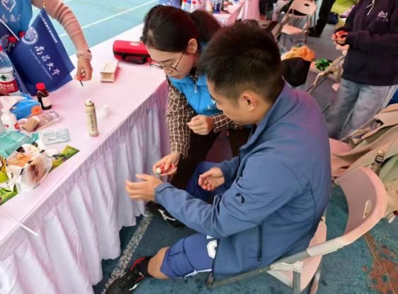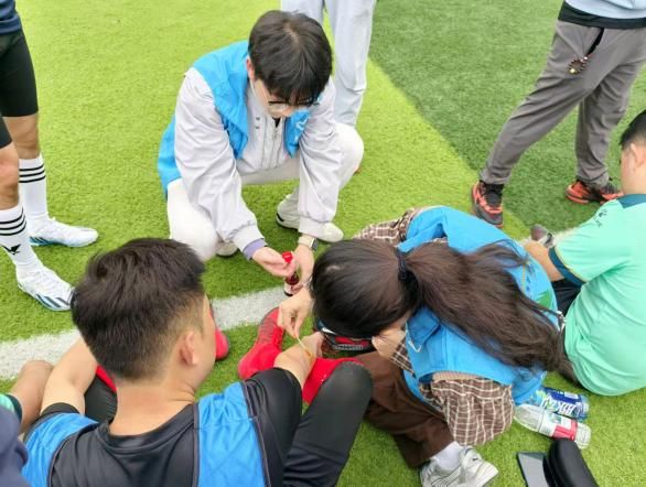赛事现场,志愿者们在天健运动场搭建起医疗服务点,配备急救箱、常用药品等物资,时刻待命。从清晨赛事筹备到傍晚赛事落幕,志愿者们全程坚守岗位,为运动员提供包括肌肉拉伤处理、伤口消毒包扎、健康咨询等在内的专业护理服务。在一场激烈的比赛间隙,一名运动员不慎腿部擦伤,学院研究生志愿者迅速上前,熟练地用双氧水清洗伤口、涂抹碘伏、粘贴创可贴,整个过程专业且高效,让运动员得以快速重返赛场。还有选手出现肌肉酸痛情况,志愿者们运用专业知识,为其进行穴位按压、肌肉放松指导,缓解不适。