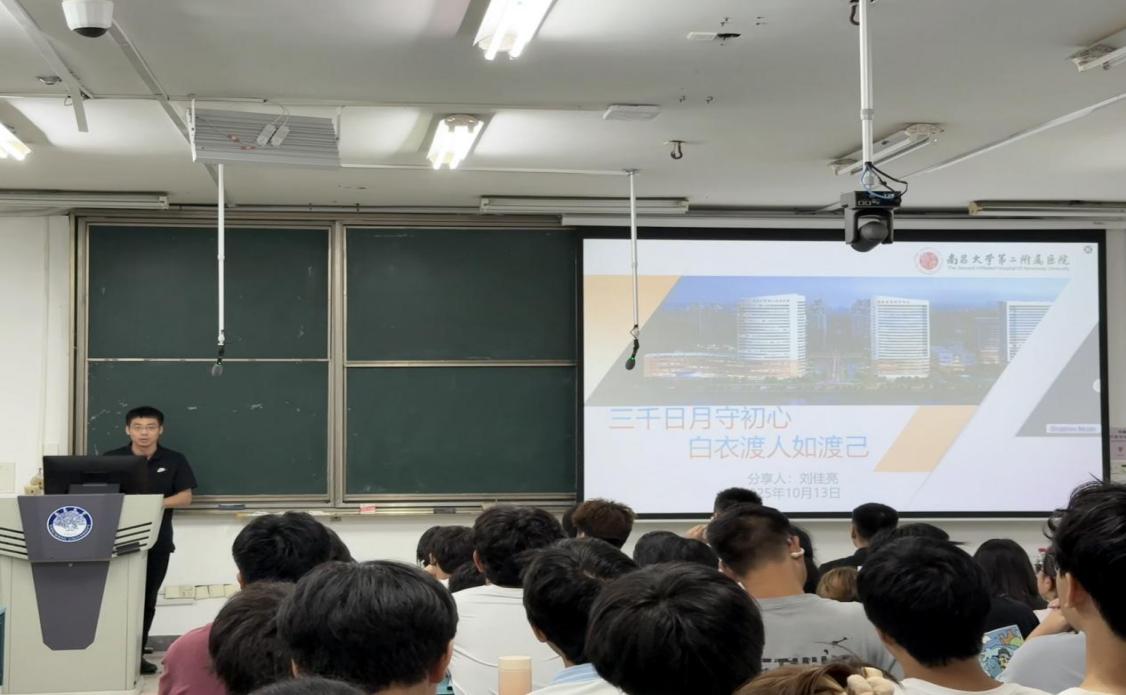 10月13日晚,护理学院“南护菁谈”系列活动之“天使讲坛”在前湖南院第一教学大楼302教室成功举办。本次活动特邀南昌大学第二附属医院三位优秀校友——护理部副主任方亮、呼吸监护室护士长周极新、内镜室主管护师刘佳亮重返母校,结合自身成长经历与职业感悟,为在场师生带来了一场兼具专业深度与情感温度的精彩分享。现场座无虚席,互动气氛热烈。