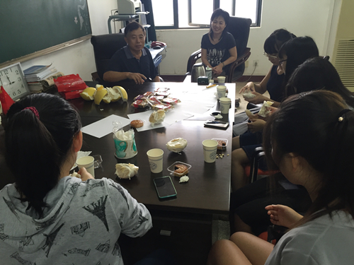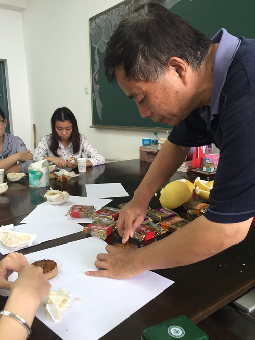 “我把他们当女儿一样看,过中秋他们都回不了家,今天就在办公室和他们一起过”肖鲁良主任边切着柚子边说道。不一会儿他“连心”的两个寝室6名同学来到了肖主任办公室,他们吃着月饼、品着甜柚说有笑就像一家人,学生们聊着近期的学习、生活、工作情况,在说到一些困难时,肖主任用笔一一记下。程志红书记也给他们送去了节日问候,并说道:“同学们一定要好好学习,不辜负肖伯伯对你们的爱心”。