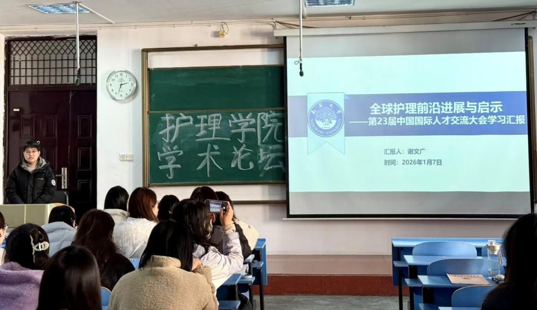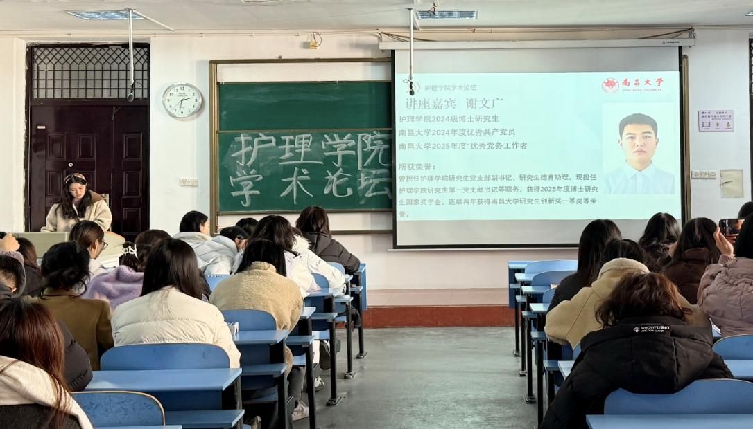 为拓宽研究生的全球学术视野,精准把握护理学科前沿动态与科研方向,2026年1月7日下午,我院在东湖校区教学大楼4001教室成功举办第16届“前湖研讲”研究生学术文化节之“南小研”微讲堂(第235期)宣讲活动。讲座特邀护理学院2024级博士研究生、优秀研究生党员谢文广担任主讲嘉宾,围绕“全球护理前沿进展与启示”这一主题,共同探索全球护理领域的前沿动态与科研方法,百余名研究生到场聆听。