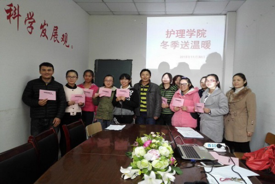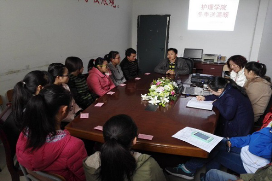 2015年11月30日,在11月份的最后一天里,护理学院在会议室进行了又一年的冬季送温暖座谈活动。2015级特困建档的8名同学和学院学工的老师们参加了此次送温暖活动