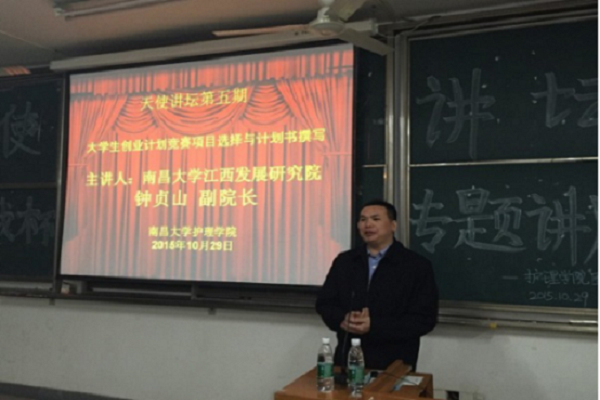 (护理学院 记者 杨阳)10月29日晚7点,护理学院天使讲坛第五期-大学生创业计划竞赛项目选择与计划书撰写讲座在医学院第一教学大楼204教室举行。江西发展研究院副院长钟贞山做客主讲,护理学院党总支副书记彭金生携学工老